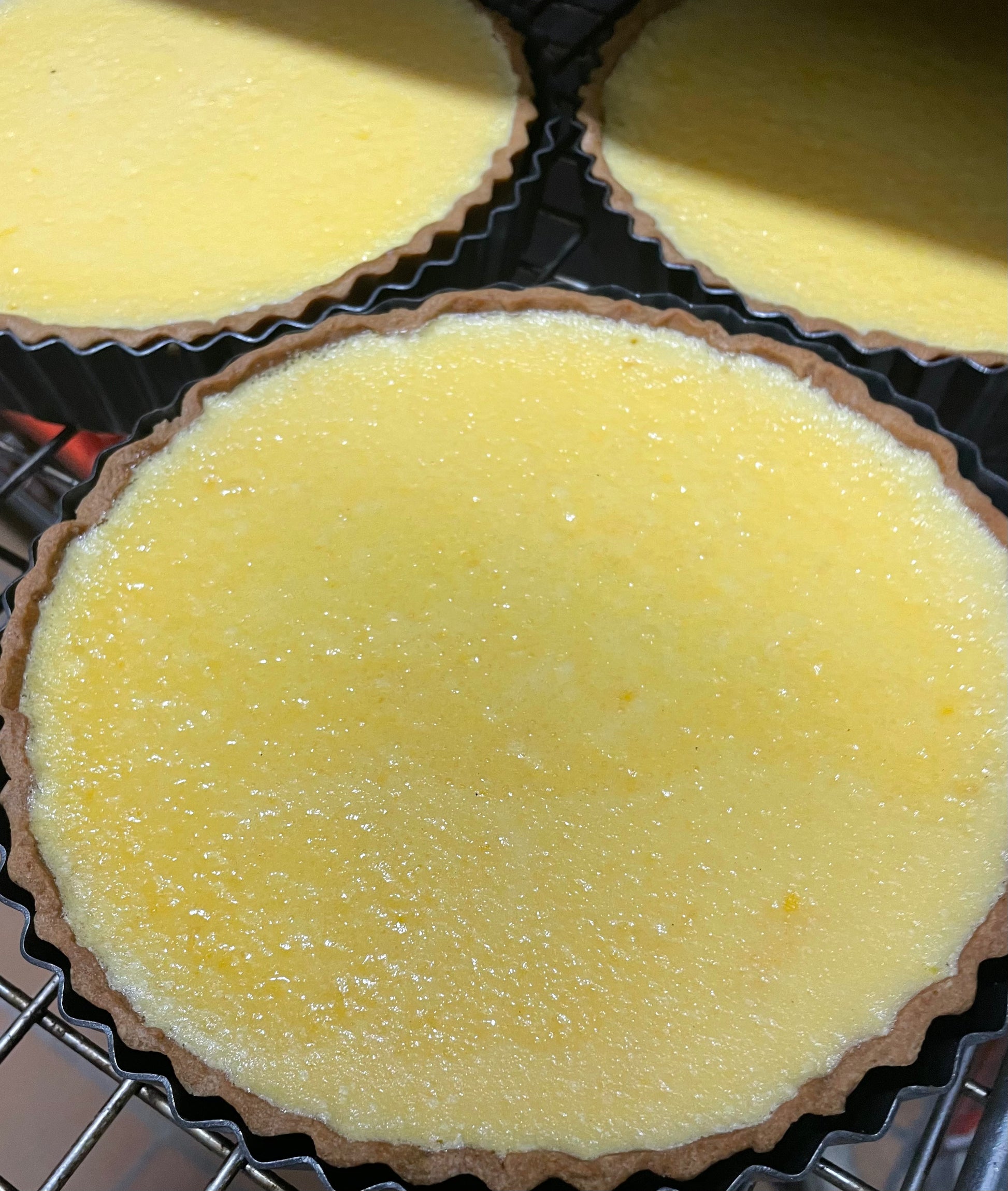 8” lemon cream tart. Sweet crust base with fresh lemon, cream, egg and sugar baked filling.